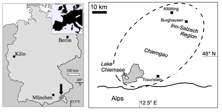 Fig. 1. Location map for the Chiemgau meteorite impact strewn field.