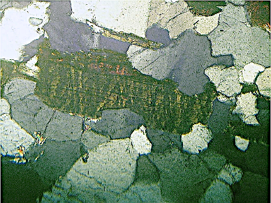 Fig. 30. Quartz grain, brittle fracture, micro. Photomicrograph, crossed polarizers. – One example only out of a volume of comparable mineral deformations in thin sections from the Chiemgau impact strewn field: