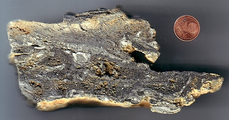 Fig. 28. Rubielos de la Cérida (Spain): Melt glass from the central-uplift chain. Both a shock-produced melt or a formation by extreme dynamic metamorphism in the cratering process (pseudotachylite) are discussed. More can be read here.