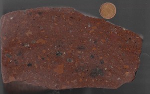 Fig. 9. Impact melt rock from the Siljan ring impact structure, Sweden. The classification is not quite clear, and the impactite may as well be termed a suevite or a transition between both.