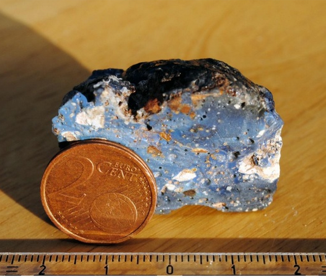 Fig. 46 – 1. Blue glass with shocked rock and metallic inclusions, Saarland impact. (image Berger 2014)