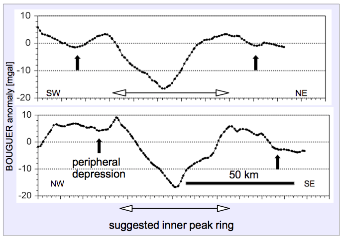 Gravity residual profiles across the Lairg impact structure revealing an inner peak ring and peripheral depressions.