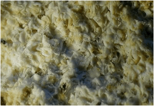 Fig. 18. Coating and cotton wool-like scraps of white carbonate material in a strongly vesicular calcitic framework: possibly relics of carbonate melt. Megabreccia between Escorihuela and El Pobo/Corbalán; southeastern rim of the impact basin.