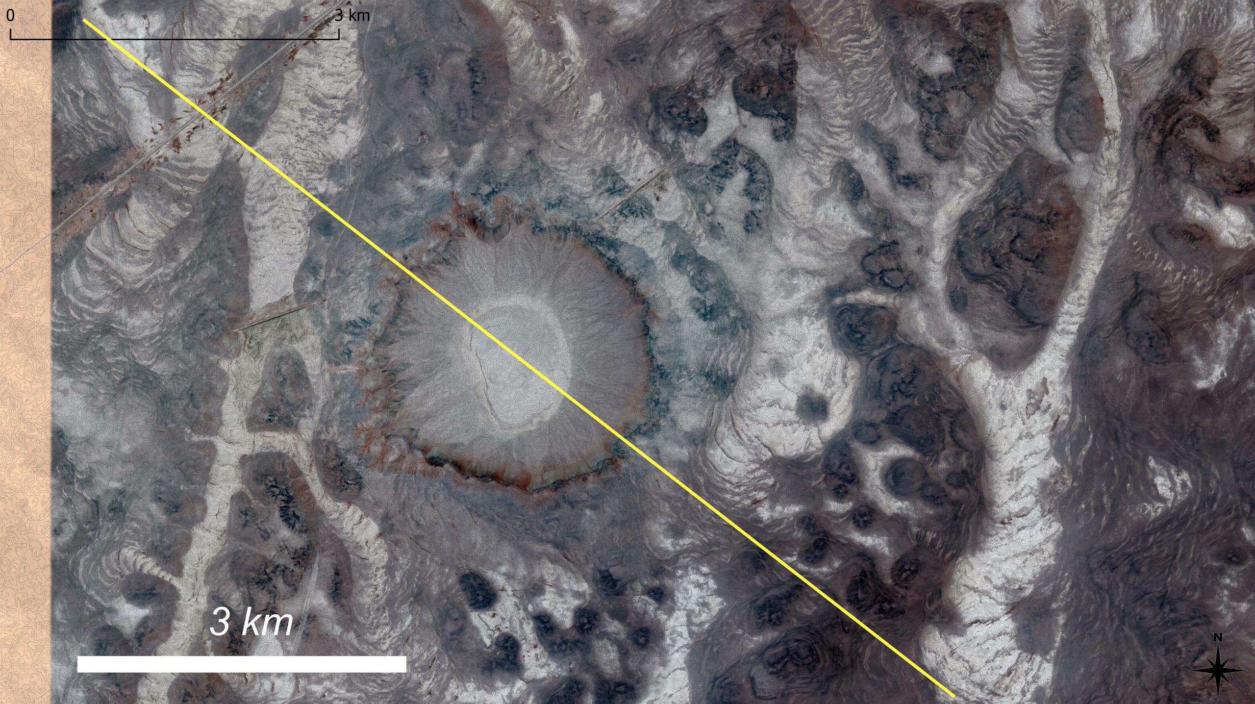Al Uchaimin crater, well-known main crater surrounded by a recently established larger impact strewn field