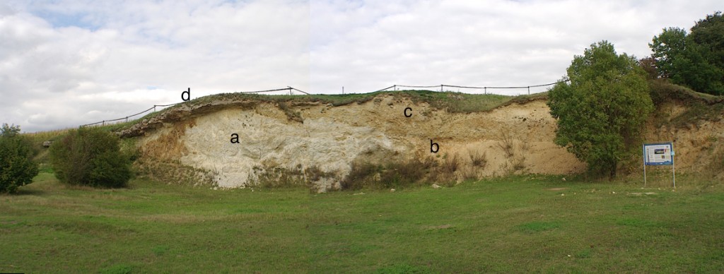 Fig. 12. Wengenhausen abandoned quarry (now a geotope), inner ring of the Ries crater. a = heavily shattered crystalline rock (granitoid); b = paltry remnants of a hornblende kersantite dike where in the past nice shatter cones could be taken out; c = polymictic crystalline breccia; d = fossil-rich limestone that formed in the post-impact Ries crater lake.
